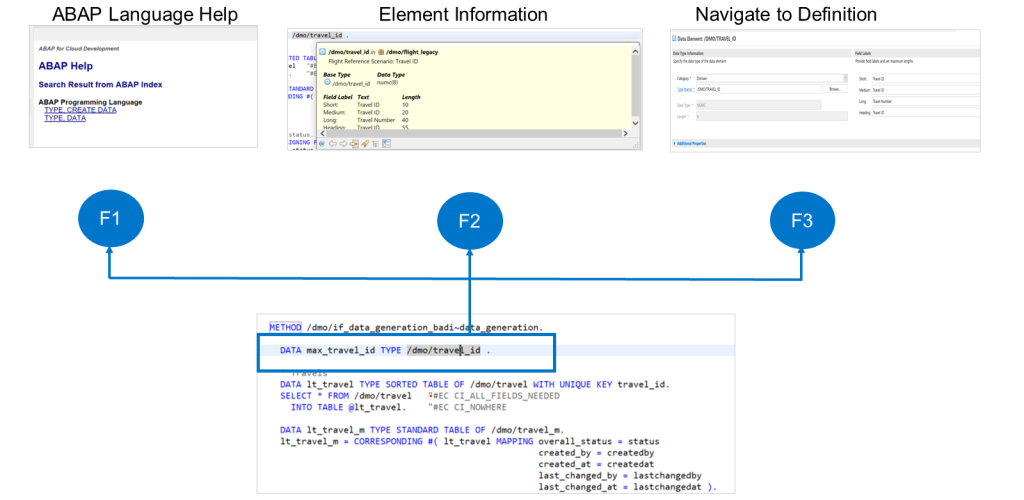 F1The F1 key displays the ABAP language help for the current statement. A statement is the name for a command in ABAP.F2The F2 key displays information about the element on which the cursor is placed.F3The F3 key navigates to the definition of the object on which the cursor is placed. You can return from there to the original object using the key combination, ALT + LEFT ARROW, on your keyboard.